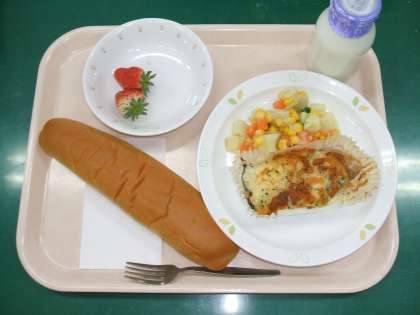 *黒ざとうパン *鮭のマヨネーズ焼き *マセドアンサラダ *くだもの(いちご) *牛乳