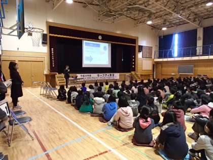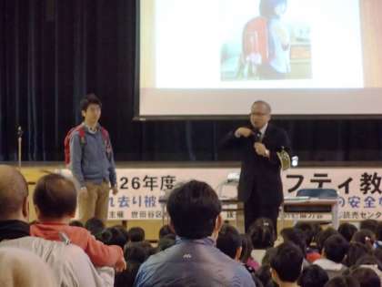 学校公開中の2月14日(土)、体育館でセーフティ教室を実施しました。読売防犯協力会の後援をいただき、低学年には「つれさり防止」、高学年には「インターネットの安全な使い方」についてでした。