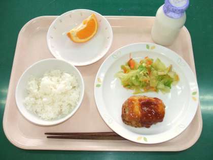 *ごはん *チーズハンバーグ *キャベツのソテー *くだもの(いよかん) *牛乳