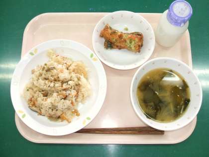 *とり五目ごはん *ちくわの磯辺揚げ *みそ汁 *牛乳