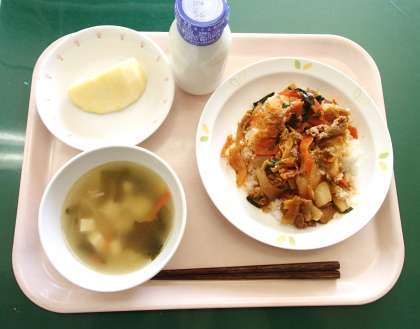 *キムチ丼 *わかめスープ *くだもの(りんご) *牛乳