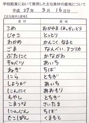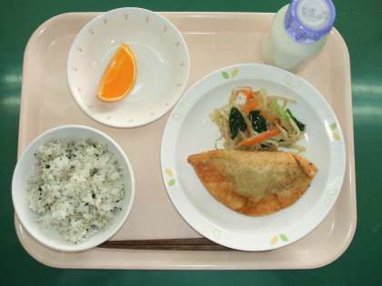 *わかめとじゃこのごはん *ジャンボぎょうざ *塩ナムル *くだもの(でこぽん) *牛乳