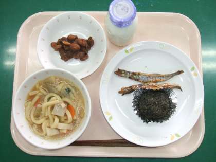 *けんちんうどん *焼きししゃも *ごまぼたもち *うずら豆の煮豆 *牛乳