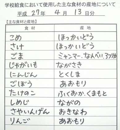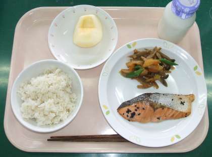 *雑穀ごはん *鮭の南部焼き *じゃがいものきんぴら煮 *くだもの(りんご) *牛乳