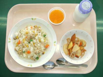 *3色ピラフ *野菜チップス *みかんゼリー *牛乳