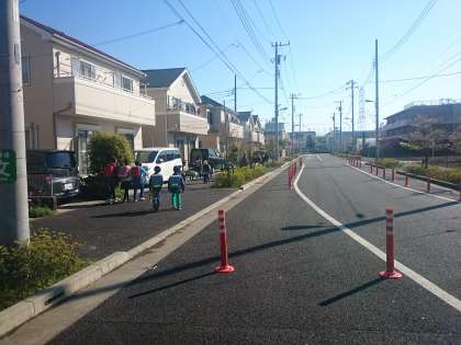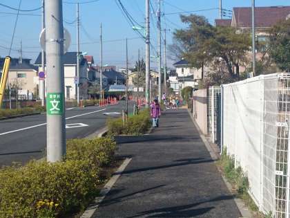 お兄さんやお姉さんの真似をして歩道を歩いて登校しています。(4月15日)