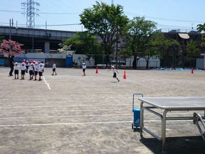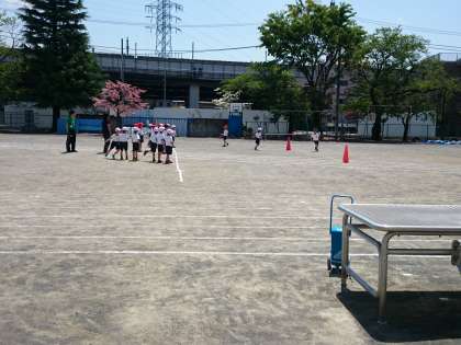 汗ばむ陽気のなか、広い校庭で体育をしました。(4月23日)
