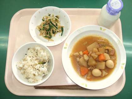 *菜めし *豚肉と大根のうま煮 *もやしのごま風味 *牛乳