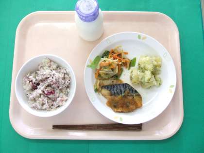 *雑穀ゆかりごはん *サバの塩焼き大根おろしかけ *野菜のおかか和え *磯香ポテト *牛乳