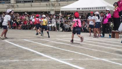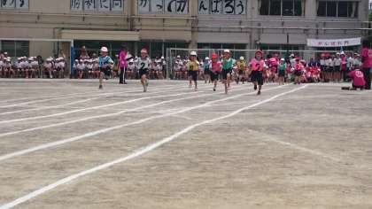 1年生、40mの直線コースを「前を見て走ること、まっすぐ走ること、ゴールまで止まらず走り抜けること」を目標に走ります。最後までがんばって走った子は、みんな一等賞です。(5月23日)
