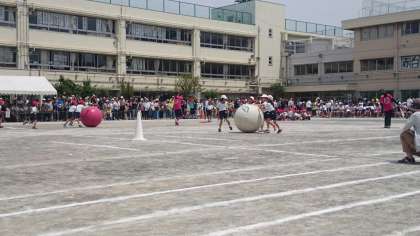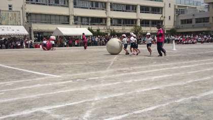 運動会(コロコロ大玉はこび 2年生) 公開日 2015/05/24 更新日 2015/05/24 2年生 1、2、3、4組の4人で協力して大玉を転がします。力を合わせ、コーンを1回転します。(5月23日)