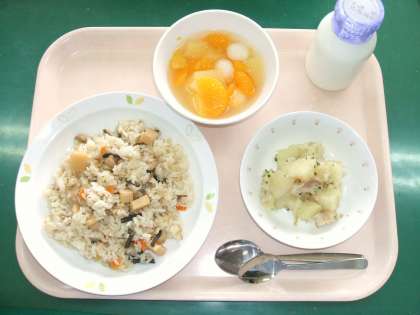 *山菜ピラフ *ジャーマンポテト *白玉入りフルーツポンチ *牛乳