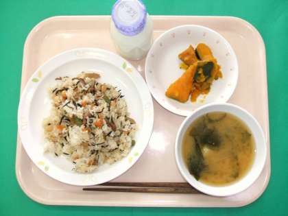 *豆入りひじきごはん *かぼちゃの含め煮 *みそ汁 *牛乳