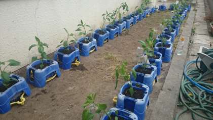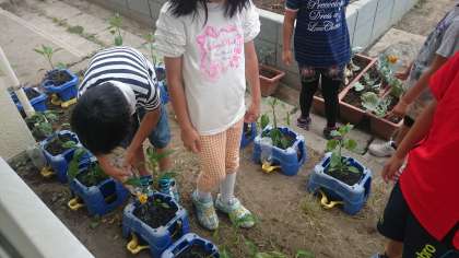 昨日植えたピーマンに水をあげながら、成長をみています。(5月29日)