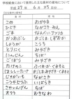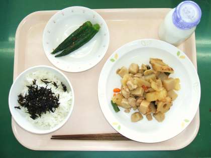 *ごはん *ひじきのふりかけ *筑前煮 *オクラのおかかかけ *牛乳