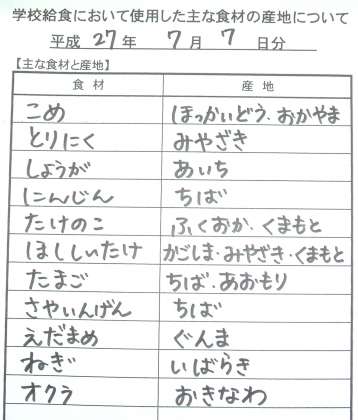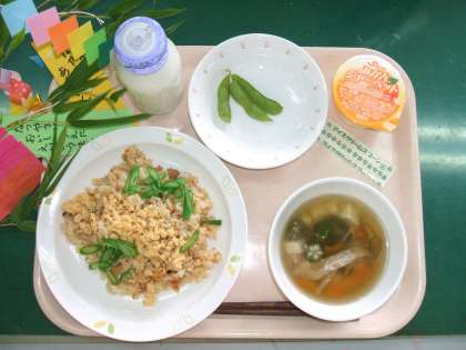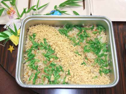 給食でも七夕飾りを添え、そぼろごはんは、天の川と笹をイメージして飾りました。