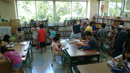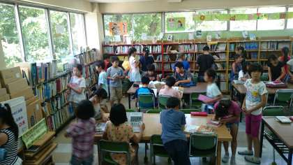 休み時間には、夏休み用の本を借りるのにたくさんの子どもたちが図書室に来ています。(7月15日)