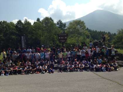 三本松で学年写真を撮りました。背景に男体山が見えています。(8月4日)