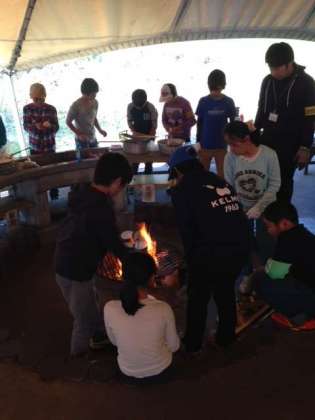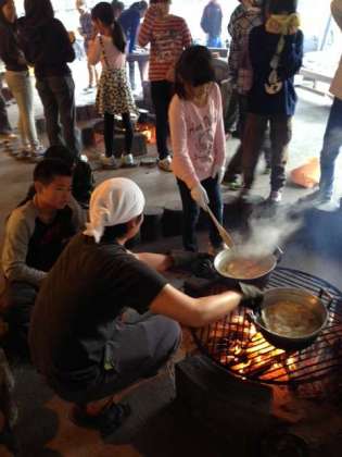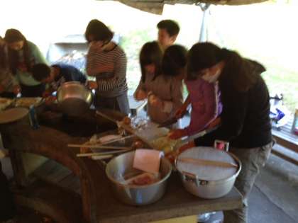 かまどで火をおこし、ご飯を炊き、カレーを作りました。