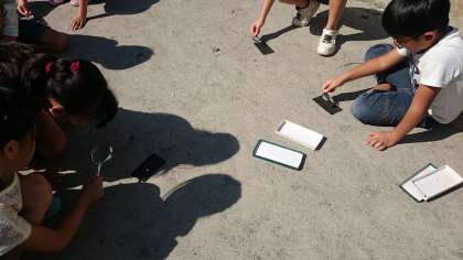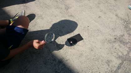 虫めがねを使って日光をたくさん集める方法を見つけ、光の性質を確かめました。(10月19日)