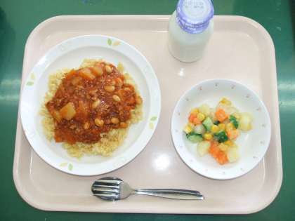 *チリビーンズライス *マセドアンサラダ *牛乳