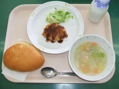 *ミルクパン *手作りコロッケ *ボイルキャベツ *ベーコンと白菜のスープ *牛乳