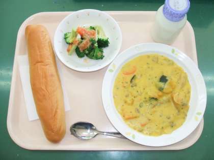 *黒ざとうパン *パンプキンシチュー *ブロッコリーラビゴットソース *牛乳