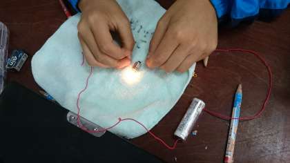今日は、豆電球の明かりがつく仕組みを確かめました。自分が予想した方法では付かなかったのでいろいろ確かめていました。明かりが付いたときはとても驚きとともに歓声があがっていました。(12月11日)