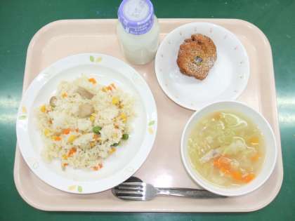 *3色ピラフ *ABCスープ *かぼちゃドーナツ *牛乳