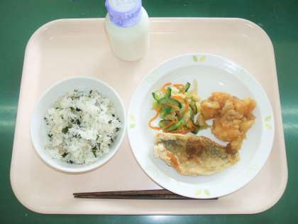 *わかめとじゃこのごはん *アジの南蛮揚げ *野菜のしょうが風味 *じゃがいもの甘辛煮 *牛乳