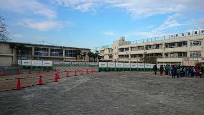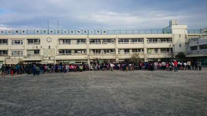 校庭が半面になったため、いつもの場所からずれての朝会でした。(12月21日)