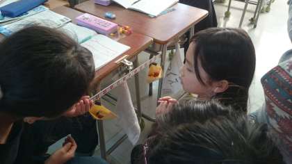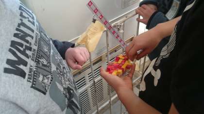 グループの友達が使っている消しゴムの重さを比べるために、同じ重さの積み木を使って調べました。(1月13日)