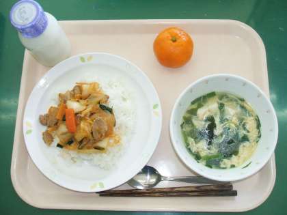 *キムチどん *たまごとわかめのスープ *くだもの(みかん) *牛乳