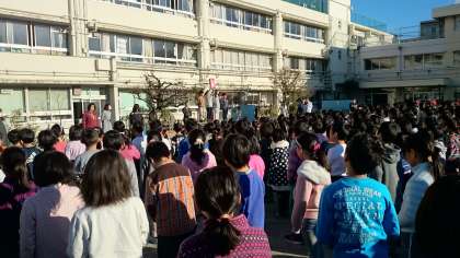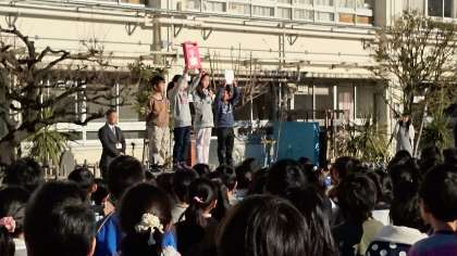 児童朝会の時に、喜多見郵便についての話を代表児童がしました。(1月25日)
