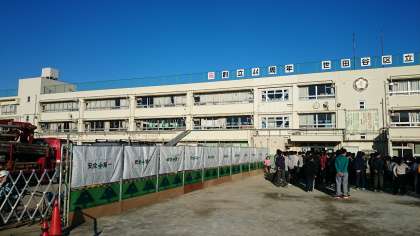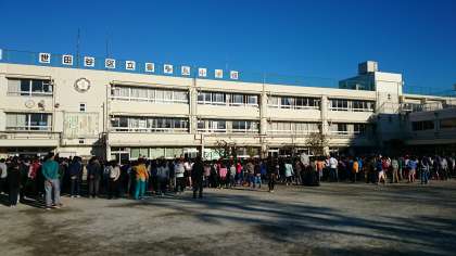 校舎改築工事のため、校庭の半面で朝会が行われました。(1月25日)