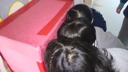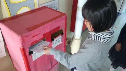 喜多見郵便がはじまりました。ポストに投函する子どもや、中に入っているハガキに興味があってのぞき込んでいる子ども達がいました。(1月26日)