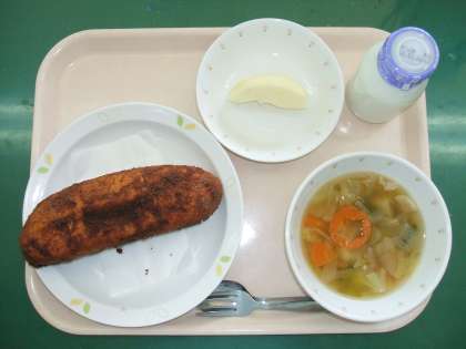 *ココア揚げパン *白いんげんのいなか風スープ *くだもの(りんご) *牛乳