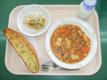 *ガーリックトースト *ビーンズシチュー *こんにゃくサラダ *牛乳