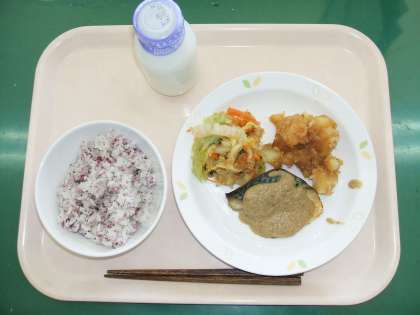 *ゆかりごはん *鯖のごまだれかけ *野菜のおかかあえ *じゃがいもの甘辛煮 *牛乳