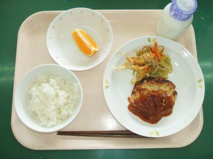 *ごはん *とうふ入りハンバーグ *ごまドレサラダ *くだもの(でこぽん) *牛乳