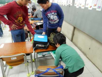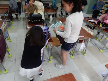 1年生のお世話をしています。教科書の入れ方などを教えたり、一緒に遊んだりしています。