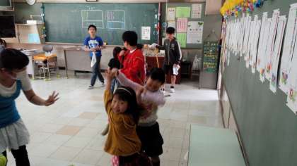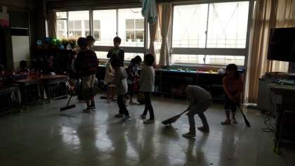 1年生のそうじを6年生が手伝っています。1年生はお兄さんお姉さんとそうじができて、楽しそうです。