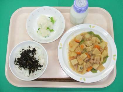 *ごはん *ひじきのふりかけ *新じゃがのそぼろ煮 *かぶのレモン風味 *牛乳