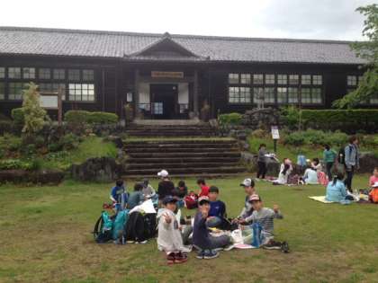 民俗資料館の前で早めの昼食です。おうちの方に用意していただいたお弁当、最高の味です。