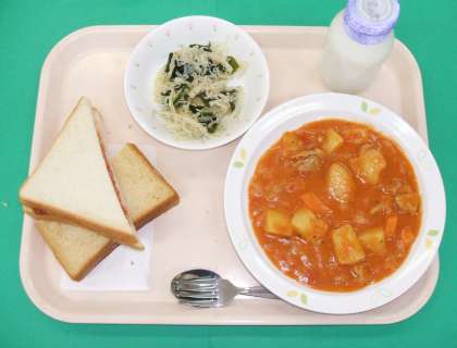 *2色サンド *トマトシチュー *じゃこサラダ *牛乳