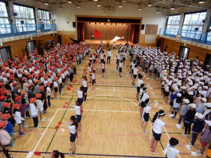 音楽朝会 公開日 2016/05/20 更新日 2016/05/20 その他の教育活動 運動会の歌、「ゴーゴーゴー」の練習をしました。赤白に分かれて、元気いっぱい歌いました。子どもたちの声が体育館中に響いて、すごい迫力でした。 応援団がオリジナルで考えた振り付けも、工夫されていてかっこよかったです。(5月17日)