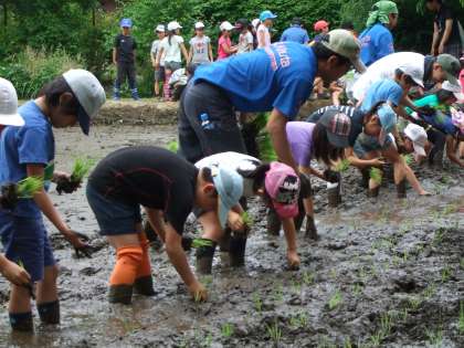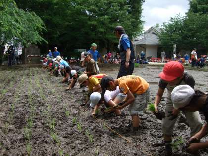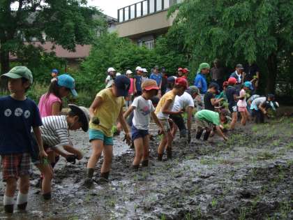 次大夫堀公園へ田植えに行きました。靴を脱ぎ、靴下で田んぼの中に入りました。田んぼに張られたロープについた赤い目印の下に、苗を植えていきます。思うように動けず苦労する友達に「かかとから上に上げるといいよ。」と声をかけたり、「ときどき見に来ようね。」「秋が楽しみだね。」と話したりしていました。子供達にとってとても貴重な体験となりました。