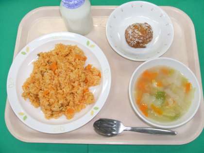 *チーズ入りチキンライス *ベーコンと白菜のスープ *かぼちゃドーナツ *牛乳