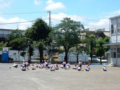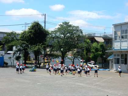 青空の下、体育です。ボールで運動をしました。(6月17日)