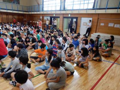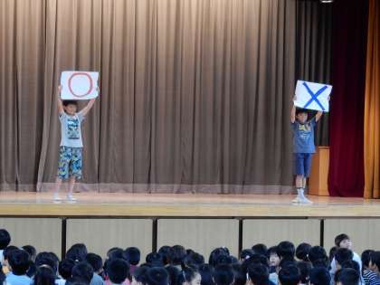 集会 公開日 2016/06/19 更新日 2016/06/19 その他の教育活動 ○×集会をしました。○だと思う人は「ゲッツポーズ」、×だと思う人は「おやじ座り」というおもしろいルールのクイズでした。(6月16日)
